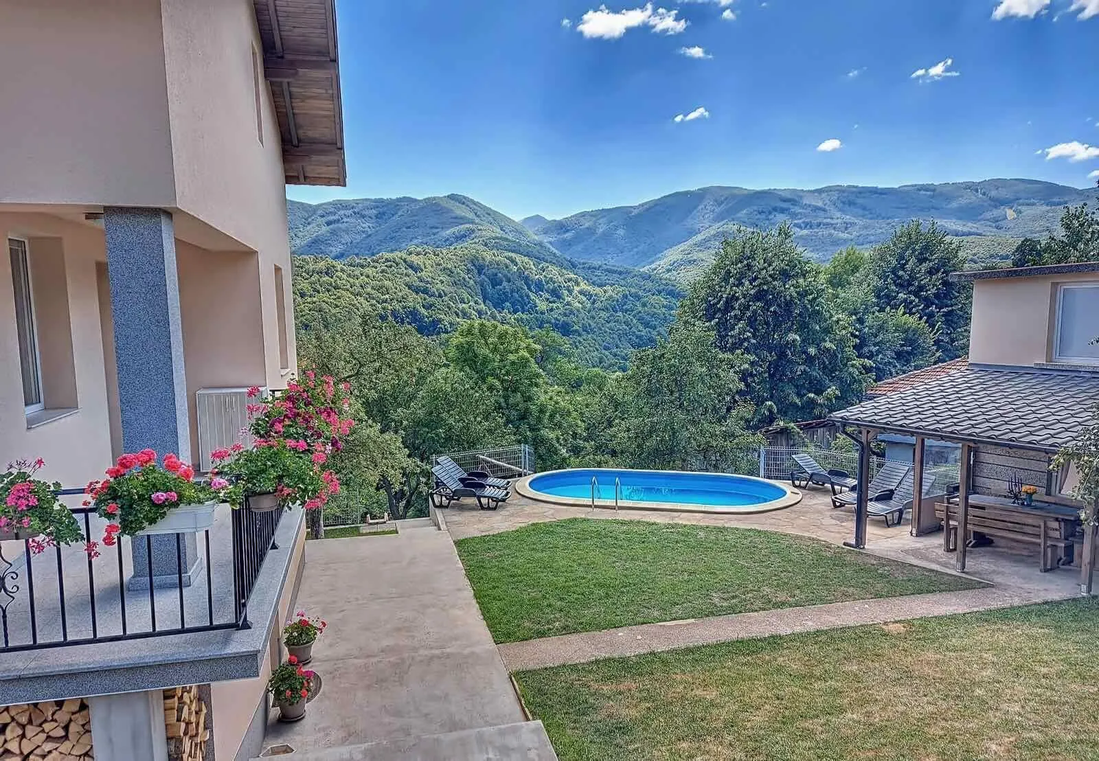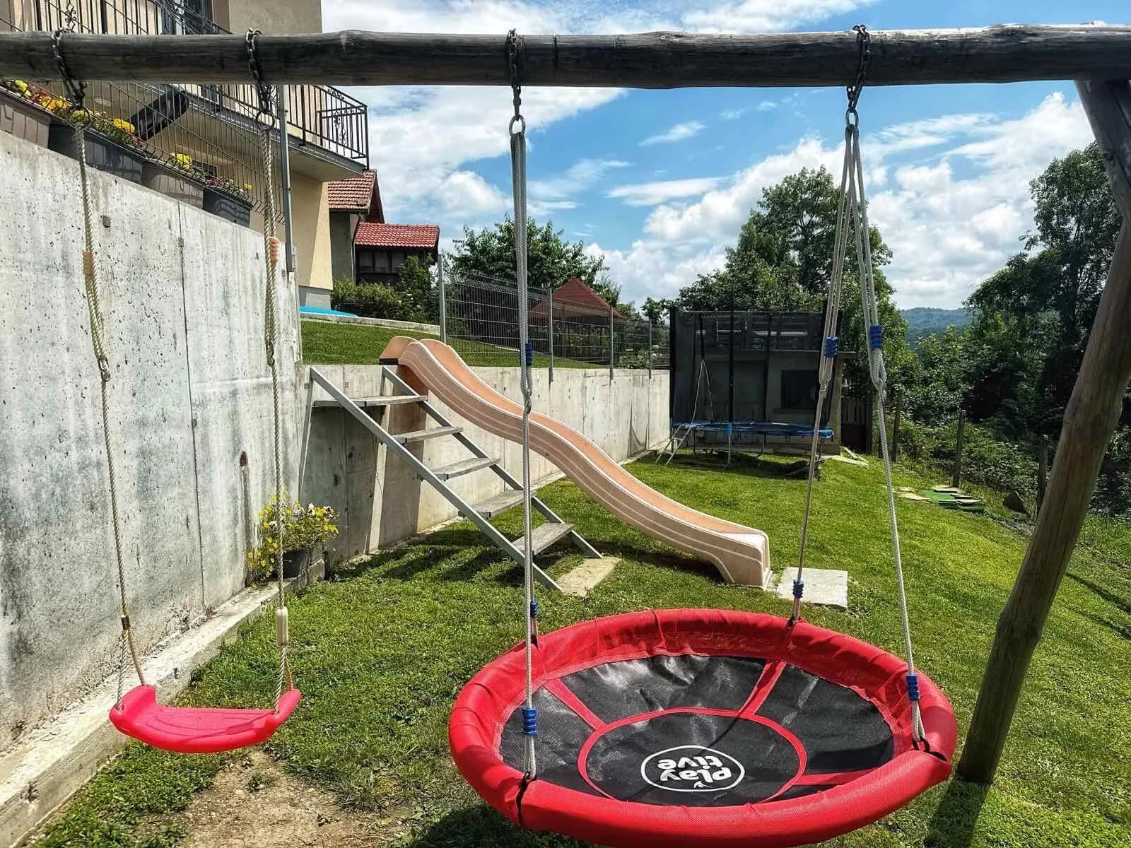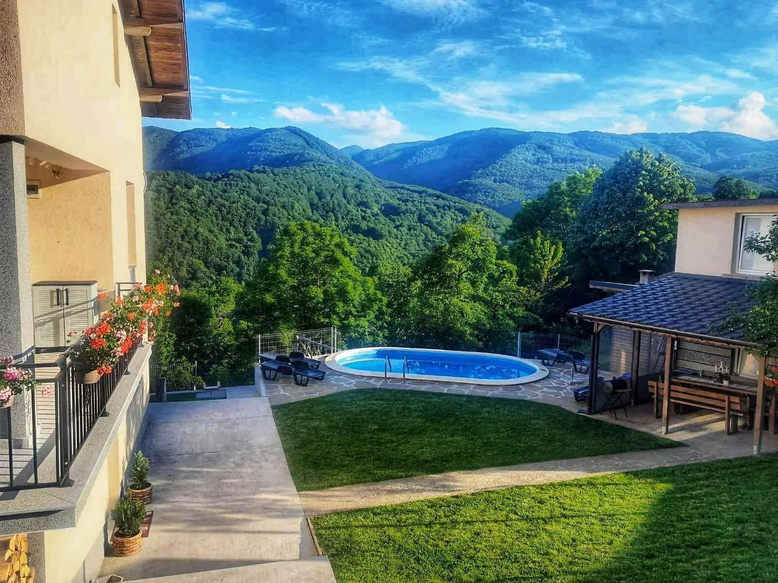 Екстри: Външен навес с маса, електрическа скара и барбекю, панорамна тераса, детски кът с пързалка, батут и люлки, частен паркинг