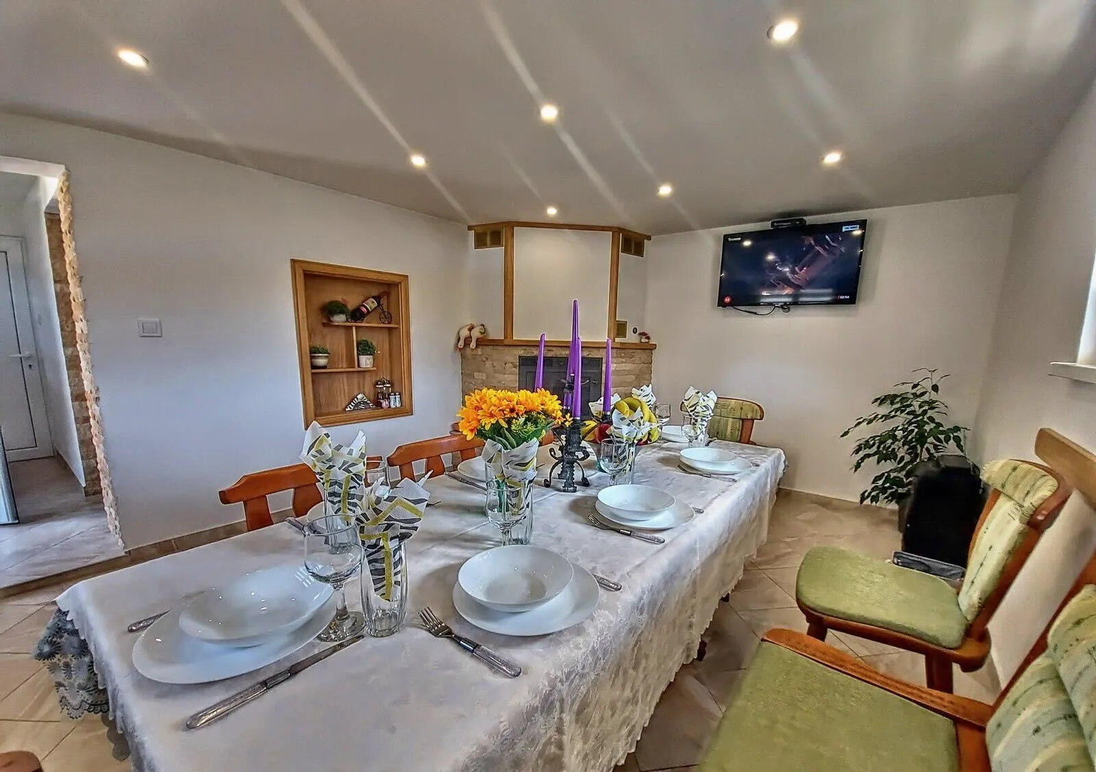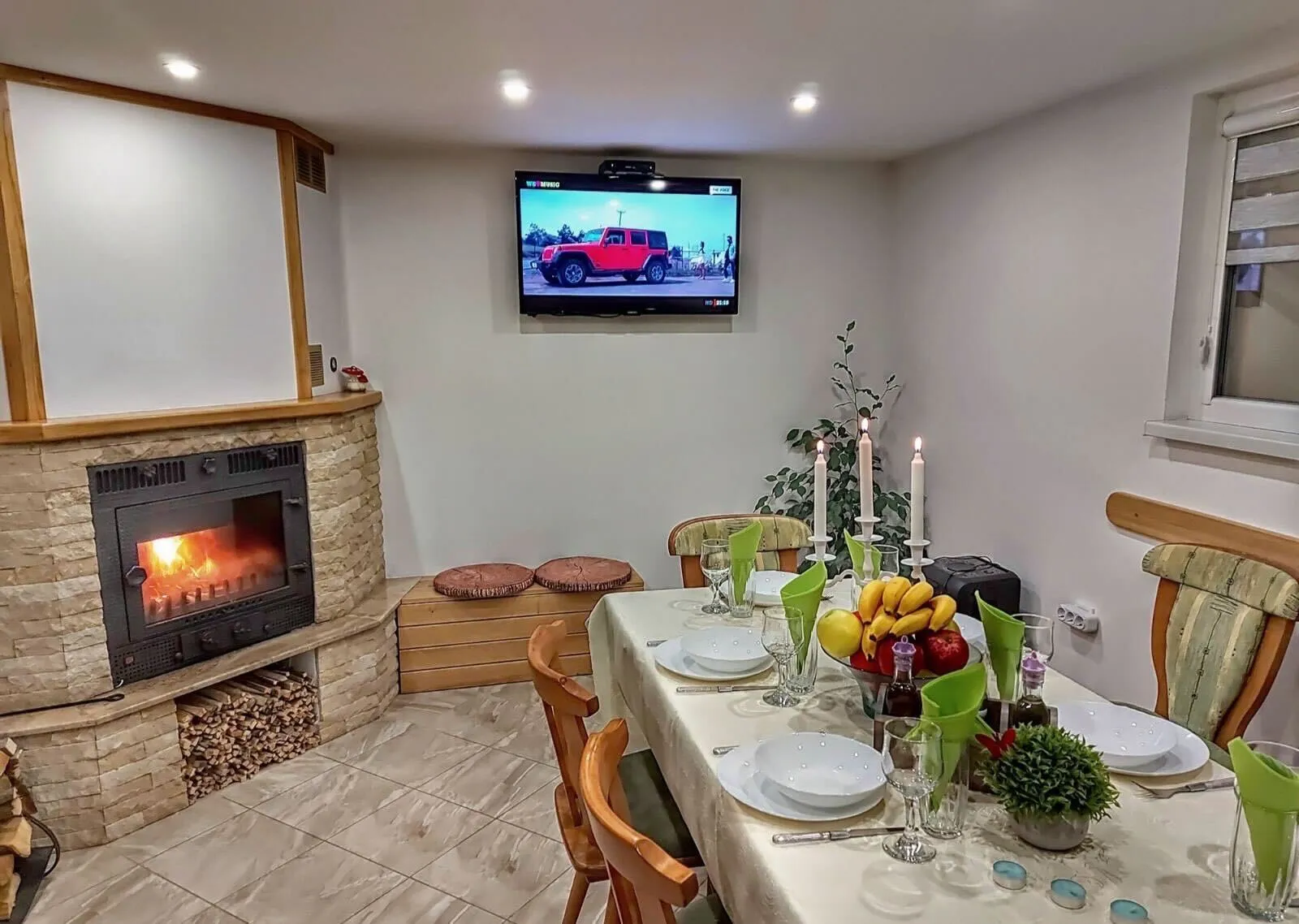 Етаж 1: Трапезария с камина, телевизор, музикална колона и кухня с пълно оборудване - вградена фурна, пералня, съдомиялна, голям хладилник, керамичен плот, микровълнова, кафеавтомат, тостер и др.